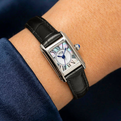 This Heritage Astoria delivers a refined rectangular design with a 24mm stainless steel case and a clean, classic profile. Its dial pairs a guilloché inner section with a mother-of-pearl outer ring, creating depth and contrast while keeping the layout elegant and traditional. Roman numerals and slim hands complete the vintage-inspired aesthetic, accented by a blue cabochon crown.