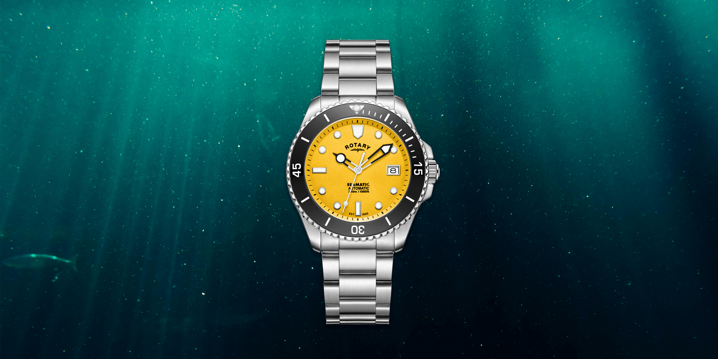 The Rotary Seamatic, the ultimate dive watch for ocean bound adventurers. Combining rugged durability with sleek design, the Rotary Seamatic is your perfect companion for underwater exploration and everyday wear. The 42mm stainless steel case and matching 3-link bracelet ensure lasting durability and refinement, while the striking black ceramic bezel adds a premium feel to the design. The bright yellow dial is covered by sapphire crystal for superior legibility, ensuring you can easily read the time no matter your environment. Powered by an automatic Miyota 8215 movement with a 40 hour power reserve.