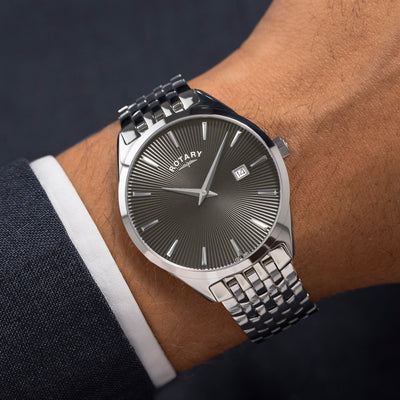 The Rotary Ultra Slim delivers a sleek highly-wearable 38mm stainless steel case that easily fits under a shirt cuff. At just 5.7mm thin, the Ultra Slim lives up to its name in delivering all day comfort. The 7-link stainless steel bracelet continues the elegance of the case curve, creating a unified feel to the watch. The lug-to-lug of 44mm gives a classic presence on the wrist.