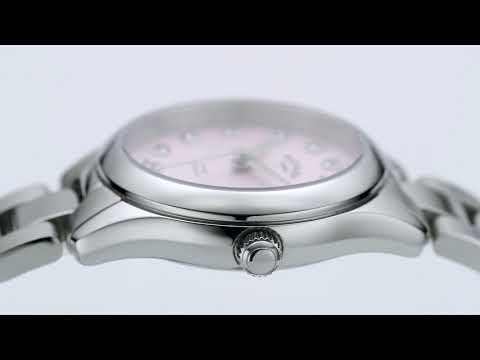 Este Rotary Contemporary luce una esfera rosa con efecto rayos de sol y 12 marcadores de diamantes. Cuenta con una caja de acero inoxidable de 28 mm y es resistente al agua hasta 50 m. El reloj funciona con un movimiento de cuarzo japonés y tiene un brazalete de acero inoxidable de tres eslabones con cierre desplegable.