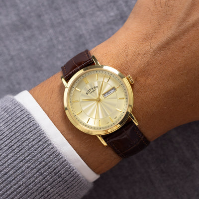 Este reloj Rotary Dress, elaborado por expertos con acero inoxidable y cristal de zafiro, presenta índices de bastón aplicados sobre una esfera guilloché color champán y una escala de minutos exterior.