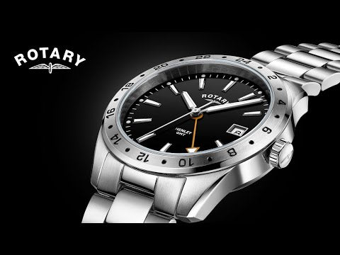 Sofisticado y deportivo, este modelo Rotary Henley es un accesorio versátil que encaja a la perfección en el mundo del diseño moderno y minimalista. Con función GMT de cuarzo, la aguja naranja con punta de flecha permite controlar la hora en una segunda zona horaria. La elegante esfera negra realza la ventana de fecha, los índices luminosos y las agujas de horas y minutos, ofreciendo una visibilidad óptima. La caja, de 40 mm de diámetro, está fabricada en acero inoxidable y se complementa con un brazalete de tres eslabones. Gracias a su robusto cristal de zafiro, este reloj es resistente al agua hasta 100 metros.