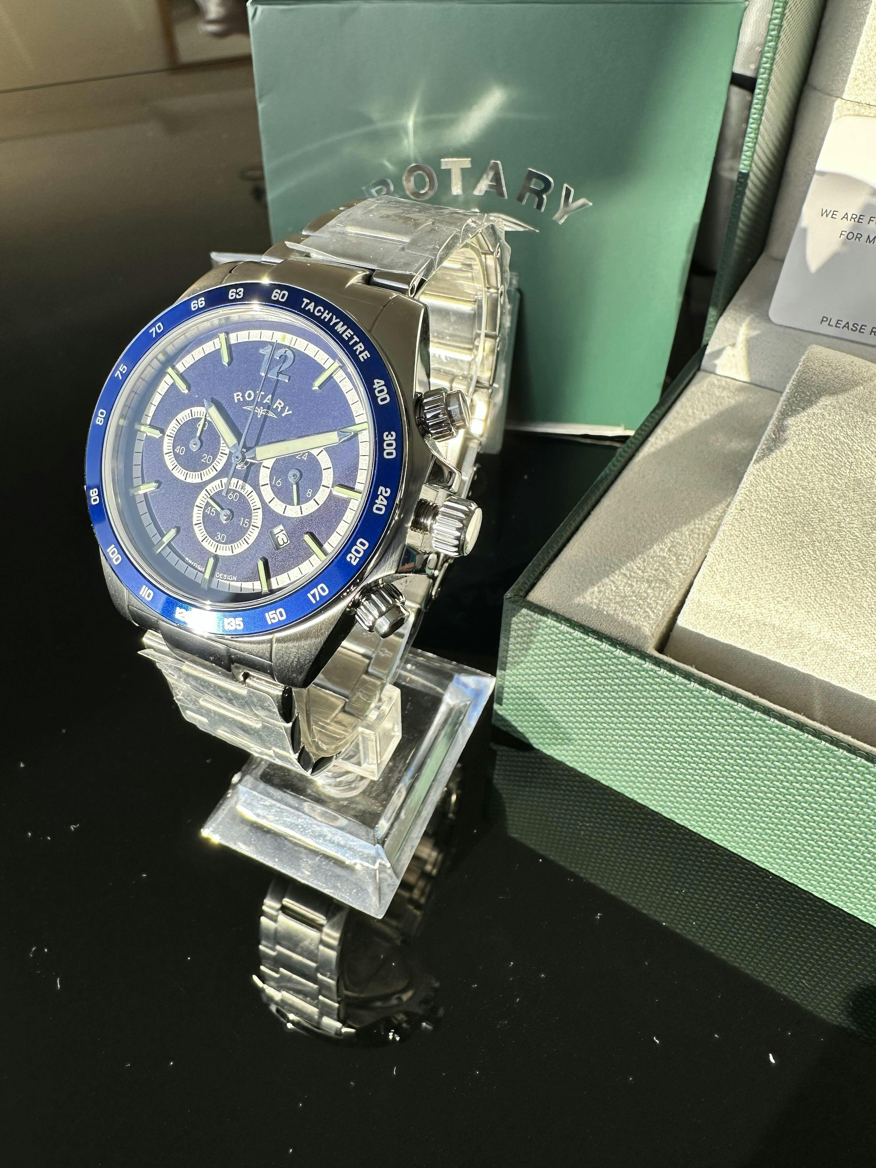 Cette montre chronographe Rotary est dotée d'un mouvement à quartz et d'un verre saphir dans un boîtier en acier inoxydable de 41 mm. Elle offre toutes les fonctions chronographe et date. Son cadran bleu, assorti à sa lunette bleue, met en valeur les index bâtons bleu clair, le chiffre arabe blanc à 12 heures et le guichet de date. Elle est également dotée de boutons marche/arrêt, d'une couronne vissée et d'un bracelet en acier inoxydable. Étanche jusqu'à 100 m.