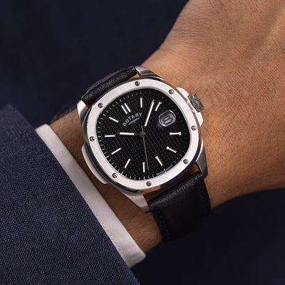 Découvrez la dernière-née de la collection Rotary Apex100. S'inspirant des designs classiques des premières montres de sport, la Rotary Sport rend hommage à l'héritage historique de précision et de durabilité de Rotary. Son élégant boîtier en acier inoxydable et son bracelet en cuir noir véritable dégagent une élégance robuste, arborant une finition polie qui souligne son raffinement. Le cadran noir, conçu pour une lisibilité optimale, est doté d'un guichet de date et d'un mouvement à quartz à trois aiguilles, parfaitement adapté à sa fonction.