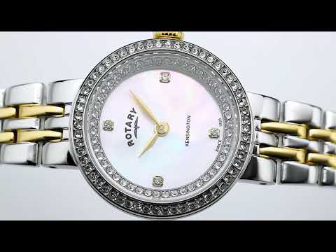 Hosting a myriad of elegant facets, this Rotary Contemporary timepiece achieves the perfect blend of function and beauty, making it the perfect piece of jewellery for a sophisticated woman. What immediately draws the eye is the watch's white mother of pearl dial with outer dial crystals, decorative crown and quarter set crystal markers. Its 25mm two-tone Gold PVD Stainless Steel case holds together a precise quartz movement and sapphire glass, as well as being water resistant to 50m. The two-tone Gold PVD Stainless Steel five link bracelet is secured with a deployment clasp.