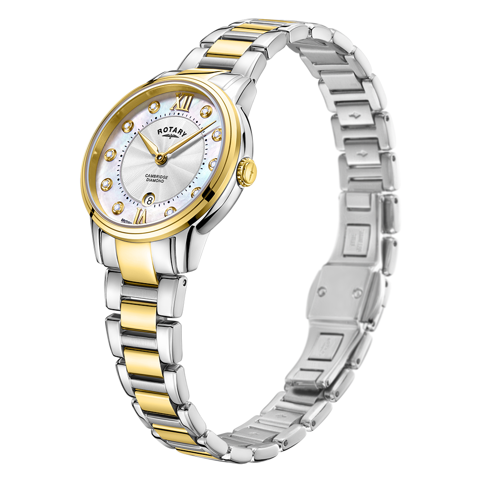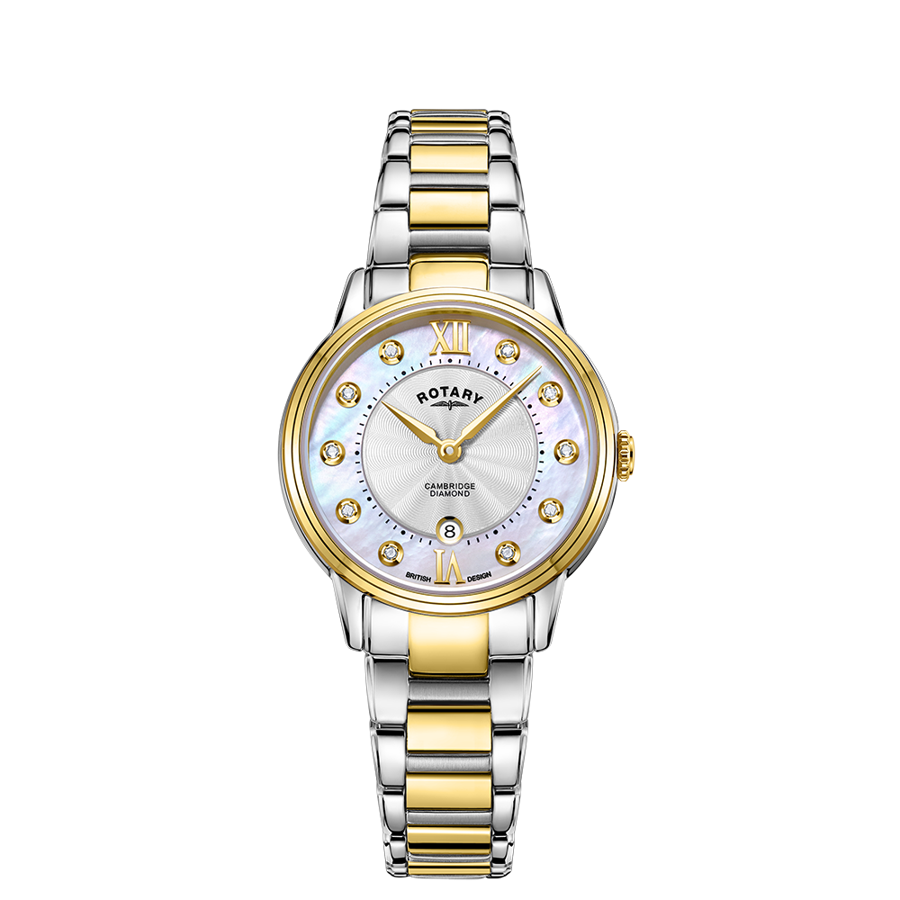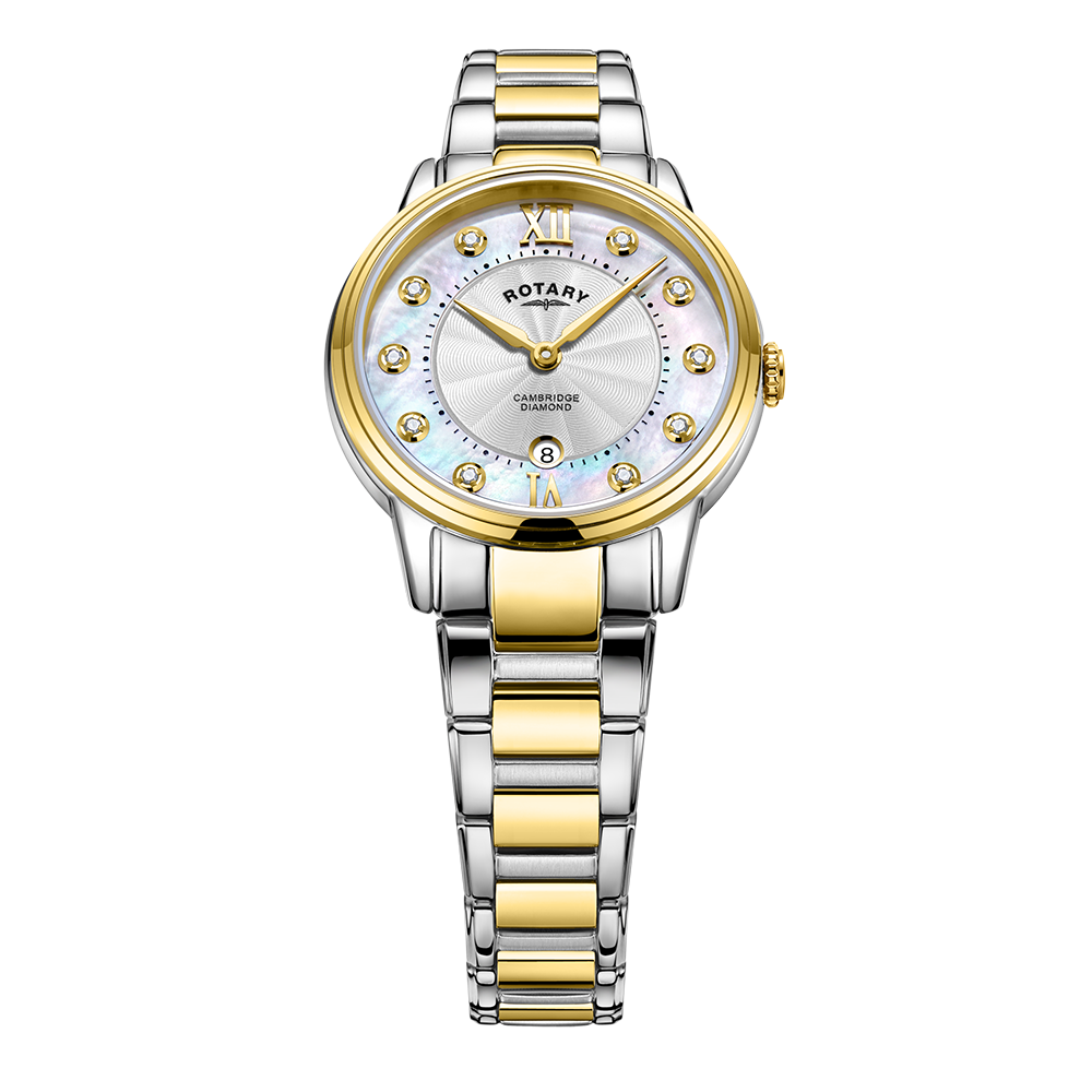 The beautiful Rotary Dress watch is characterised by a white mother of pearl outer dial with gold Roman numeral and 10 diamond hour markers, and a guilloche inner dial. Powered by a quartz movement, it features a 30mm gold PVD stainless steel case with date functionality, and is water resistant up to 50m. This classically designed ladies timepiece is built with scratch resistant sapphire glass and coupled with a two-tone 3 link stainless steel bracelet.