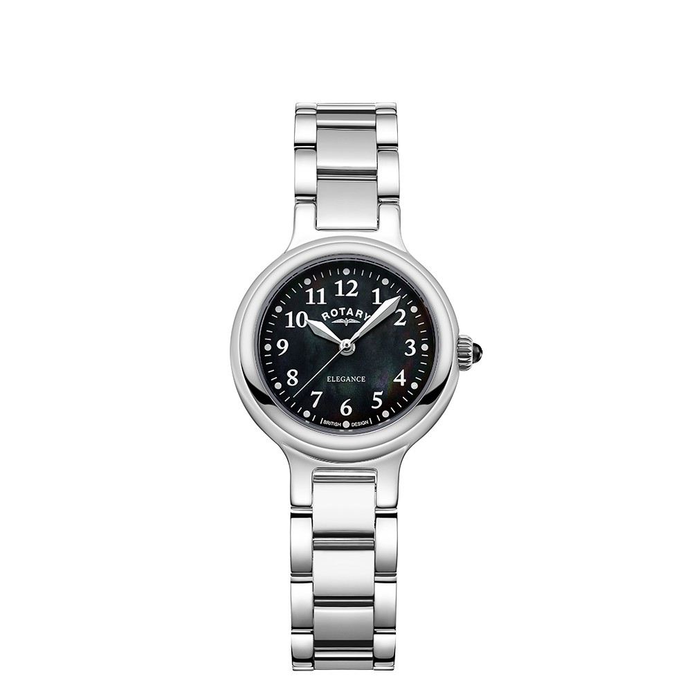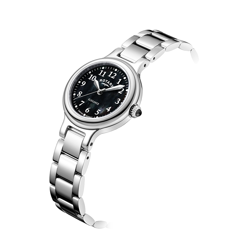 This Rotary Traditional is a sophisticated and contemporary style watch. Measuring at 28mm, the stainless steel case houses a shimmering black mother-of-pearl dial with contrasting arabic numerals for a clear, legible aesthetic. This model is protected by scratch-resistant sapphire glass and is water resistant up to 30m.