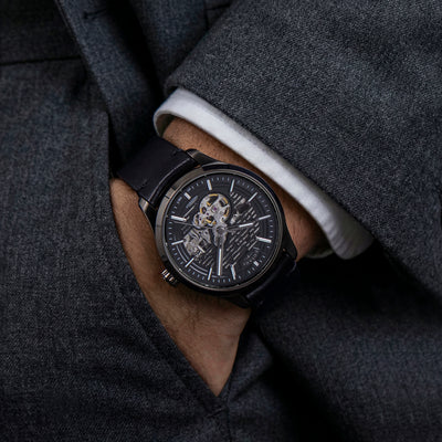 Greenwich GT1 brings motorsport-inspired engineering to Rotary’s mechanical collection. Its 42mm gunmetal 304L stainless steel case houses a partially skeletonised, multi-layer slatted black dial - a design language drawn from classic grand tourers, where exposed mechanics and airflow dictated form. Beneath the surface, the Miyota 8N24 automatic movement is visible in motion, reinforcing the watch’s mechanical character and performance-led intent.