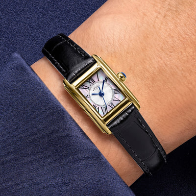 This Heritage Astoria delivers a refined rectangular design with a 24mm stainless steel case and a clean, classic profile. Its dial pairs a guilloché inner section with a mother-of-pearl outer ring, creating depth and contrast while keeping the layout elegant and traditional. Roman numerals and slim hands complete the vintage-inspired aesthetic, accented by a blue cabochon crown.