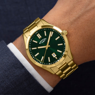 Its 40mm gold PVD case perfectly frames the deep green dial, complemented by a matching gold PVD bracelet that exudes elegance. With 50M of water resistance and a date window neatly positioned at 6 o’clock, the Rotary Heritage balances form with function.