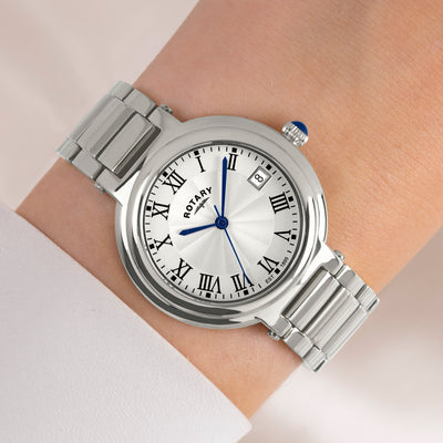 Finished with a high-shine stainless steel bracelet and powered by a reliable quartz movement, this timepiece blends classical beauty with modern-day precision - perfect for refined daily wear or special occasions.