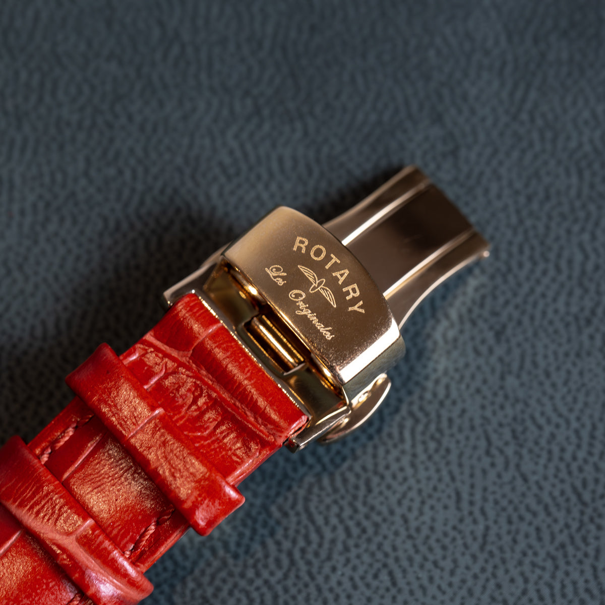This Rotary Les Originales showcases the timeless design of Rotary, featuring the precision of a Swiss automatic movement. Crafted from durable Stainless Steel with a Gold PVD coating, the 34mm case adds dimension to the white Mother of pearl dial. Complemented by a red genuine leather strap, this watch exudes a refined and elegant aesthetic. With a water resistance of 10m, it can withstand minor splashes and precipitation, making it a practical choice for everyday wear.