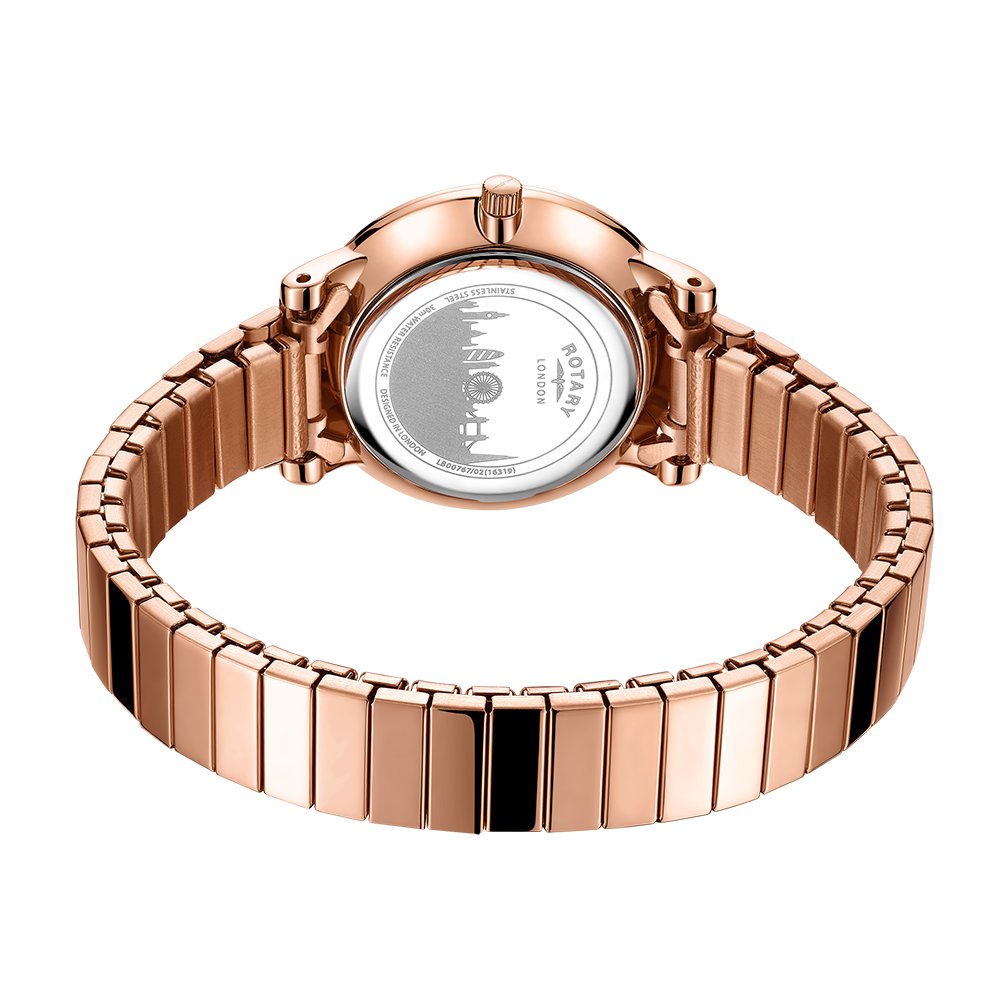 This Expander features a silver white galvanic dial with applied index markers. It features a 29mm Rose Gold PVD Stainless Steel case and is water resistant to 30m. It is powered by a quartz movement, and has a Rose Gold PVD Stainless Steel expanding bracelet. The Stainless Steel expanding bracelet is a fun and highly practical way of bringing traditional design into the 21st century. The collection seamlessly combines functionality with cutting edge British design and style: reworking a classic look into modernity.