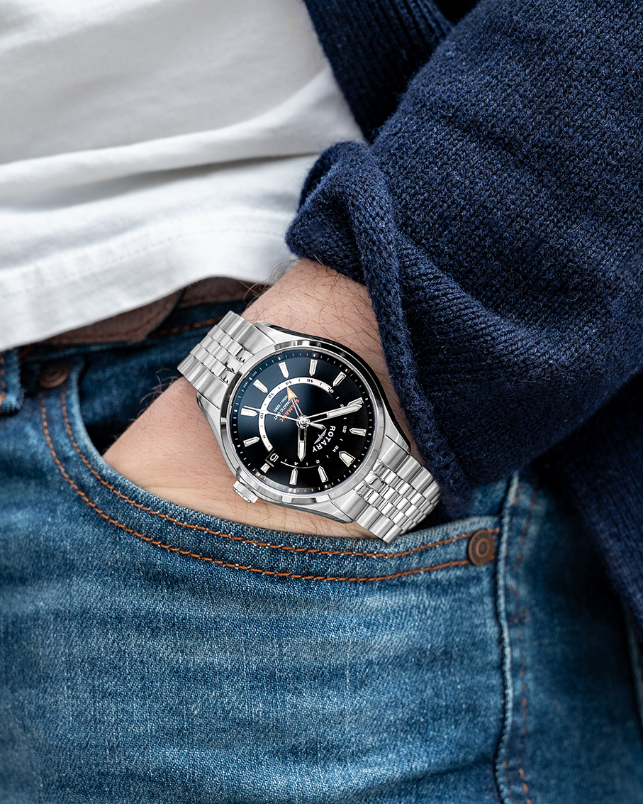 The Seamatic 100 GMT brings practical travel functionality to a clean, everyday sports design. Its 40mm 316L stainless steel case keeps a balanced profile on the wrist, while the multi-link bracelet and milled clasp deliver a solid, comfortable fit. The black sunray dial offers crisp legibility, complemented by an inner 24-hour GMT ring and a distinctive GMT hand for tracking an additional time zone with ease.