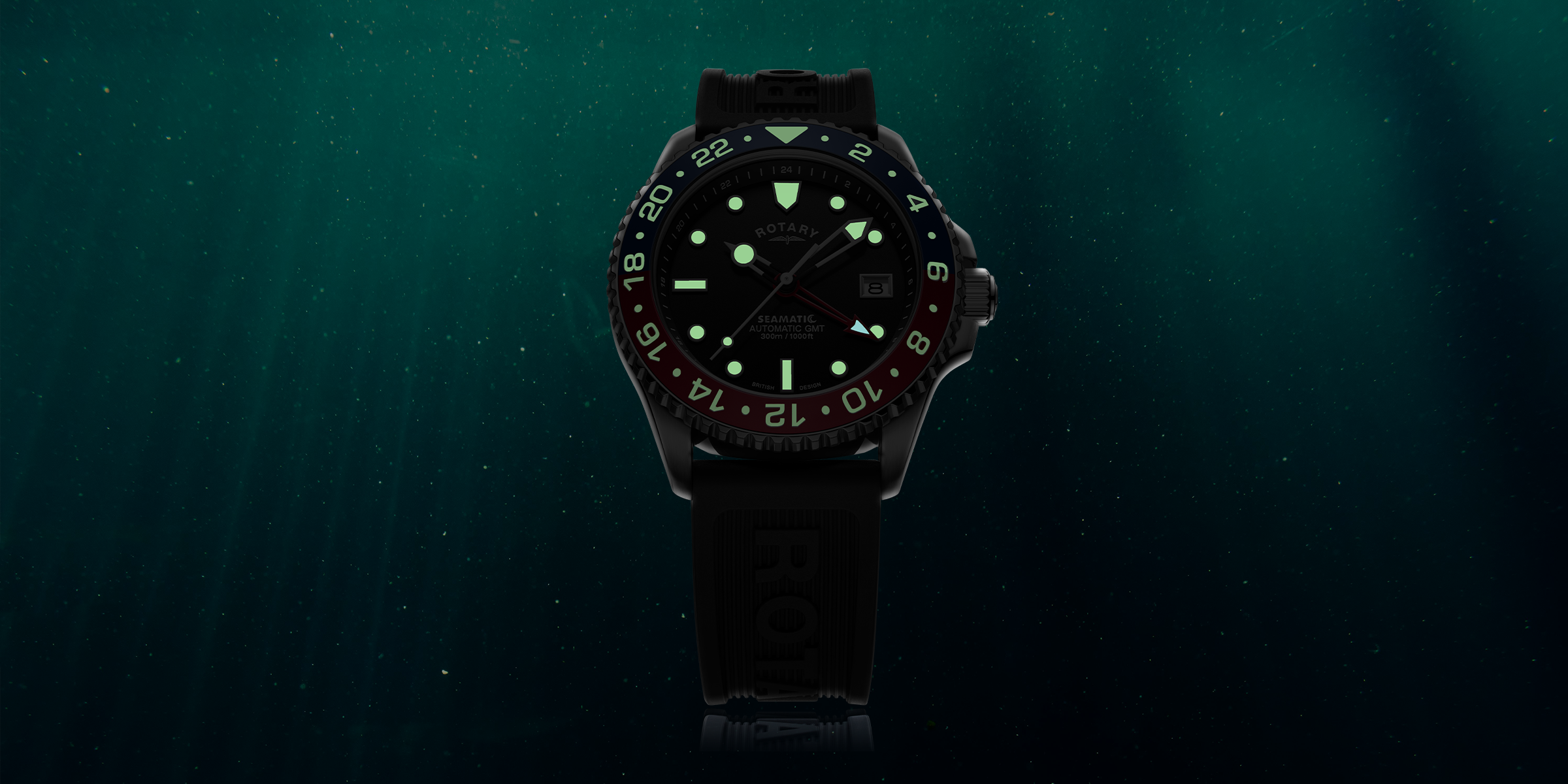 Introducing the Rotary Seamatic 300 GMT, a dive watch designed for the international adventurer. Combining rugged functionality with a sleek, modern design, the Rotary Seamatic is built to accompany you on travels to underwater explorations and beyond. Its 316L stainless steel case and durable silicone strap ensure lasting durability, while the eye-catching red and blue bi-directional GMT bezel offers both style and utility. The matte black dial is designed for maximum legibility, featuring an automatic GMT movement that adds a versatile complication for travellers.