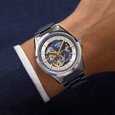 Polished gold-tone markers and hands contrast beautifully against the partially open-worked dial, while the 3-link stainless steel bracelet compliments the case and offers a premium feel. Designed for the discerning watch enthusiast, the Rotary Seamatic Eclipse balances modern watchmaking with timeless style.
