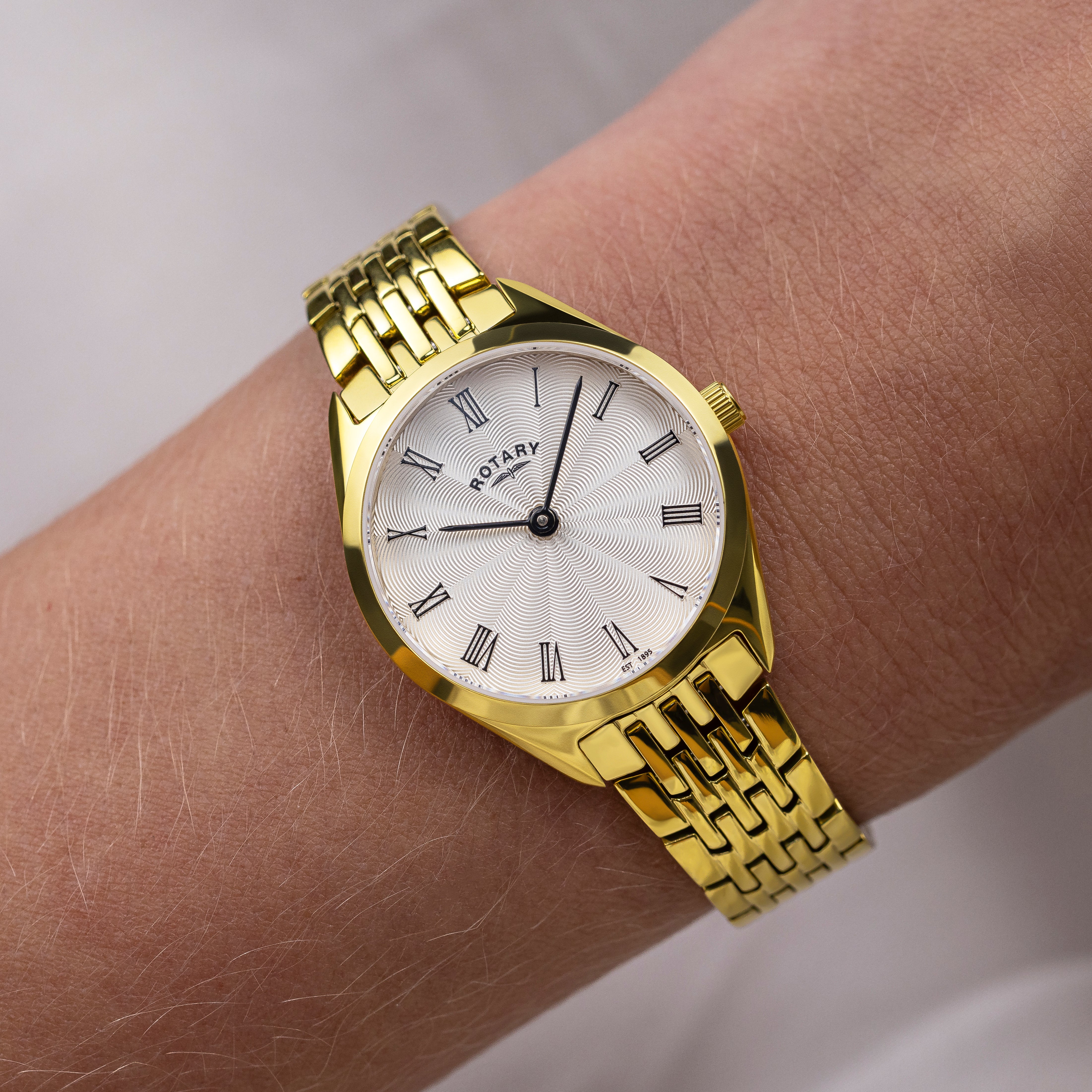 Complete your look with this refined and striking timepiece from the Ultra Slim collection. With its refined 5.7mm profile, this piece delicately slips under any shirt cuff for discreet glamour. This Ultra Slim watch features a silver guilloche dial with black Roman numeral hour markers, a 27mm Gold PVD Stainless Steel case and is water resistant to 50m. It is powered by a quartz movement and charmingly features a Gold PVD Stainless Steel seven link bracelet secured with a deployment clasp. In short, this model is a masterful example of modern glamour.