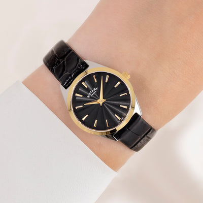 The ever-popular Ultra Slim, with a 27mm beautifully faceted case design, this Ultra Slim is the ultimate dress watch. The dial aesthetic is all about understated sophistication: the deep black, Sunray guilloche dial, applied indices and sapphire glass enhance the dressy appeal of this Ultra Slim watch. Finished with a black leather strap, and water resistant to 30m, this Ultra Slim will add class to any occasion.