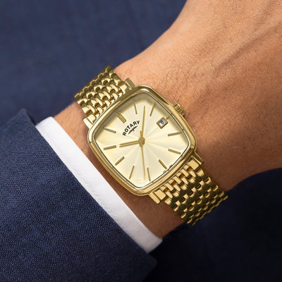 Inspired by 20th-century watchmaking, the Heritage Astoria offers a sophisticated silhouette for the modern wearer. Housed within a distinctive cushion-shaped gold PVD case, the champagne dial is detailed with linear indices and a subtle guilloche pattern that shifts with the light.